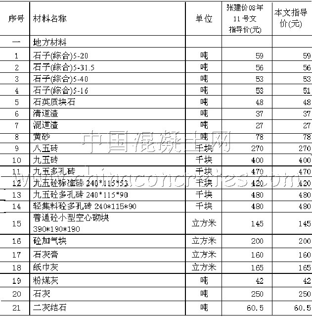 根據市場價格變化和現場采價,結合蘇州市建設局蘇建價(2008)13號文精神,經研究,決定調整建設工程材料指導價格。本次調整的價格從2008年7月1日起執行,具體指導價格詳見下表。