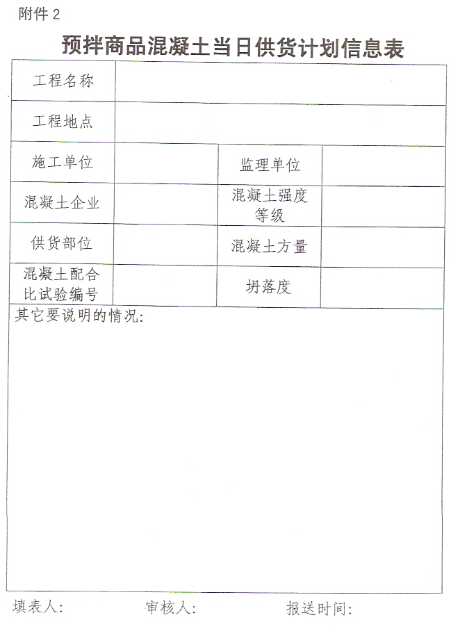2、預(yù)拌商品混凝土當(dāng)日供貨計(jì)劃信息表