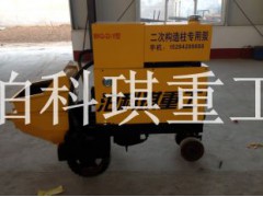 二次構造柱設備是我廠獨自研發的新型設備,主要用于建筑內外砂漿噴涂,墻體拉毛,普通樓房砂漿輸送,二次構造柱澆灌,以及邊坡噴錨支護。 憑借其強大的功能及廣范的使用途,一經上市就卷起銷售熱潮。 新型二次構造設備優點如下: 1. 適應噴涂材料:膩子粉、涂料、乳膠漆、真石漆、水泥砂漿、干粉砂漿、保溫砂漿、防水材料、防火材料、隔熱材料、吸音材料等水溶性材料。1 2. 調節流量大小,調出最佳噴涂效果。3 3. 除在電控箱上可以開關外,還配備遙控開關噴涂。9 4. 噴槍與送料管的連接可以旋轉,便于操作。3 5. 施工效率高,質量好。2 6. 體積小巧,便于現場搬運,而且配件費用低, 維修簡單。1 7. 使用方便、速度快、省材料、省人工、更省錢,一臺機器只配三個人, 150平方/小時厚度2cm。5 8. 材料比例水泥0.7:3砂漿。 一流的品質、一流的服務,讓購機成為一種享受,讓新的設備成為一股熱流,讓您買的舒心,用著放心。 品牌:其他 型號:BKQ-20 規格:2300*800*1300mm 產品別名:細石砂漿泵用途:輸送細石砂漿 適用行業:二次結構詳細說明: 產品介紹應用在高層建筑灰砂漿及細石混凝土輸送、二次構造柱注漿、水庫、水電站、港口、碼頭中各種壓力注漿,基礎處理、軟弱地基、加固注漿、隧道、地鐵、礦山施工中回填灌漿錨桿支護。產品屬性型號 BKQ-20 工作形式 液壓活塞式 最大壓力 25 Mpa 輸送砂漿最大料徑 1cm 施工量 0.5-10m3 灰砂比 1:3 灰漿、砂漿、石子比例 1:2:1 垂直輸送距離 100m 水平輸送距離 300m 整機重量 600KG 外形尺寸(長×寬×高) 2300×800×1300mm 液壓缸徑 110mm 出料口直徑 51mm 進料口直徑 51mm 主動力 18kw 電壓 380V 其他說明本產品采用液壓式送漿,振動網過濾雙缸往復作業完全能夠輸送建筑應用中各種砂漿、細石混凝土等,本品具有排量大,壓力高、省工省料,移動靈活等特點,是一種理想砂