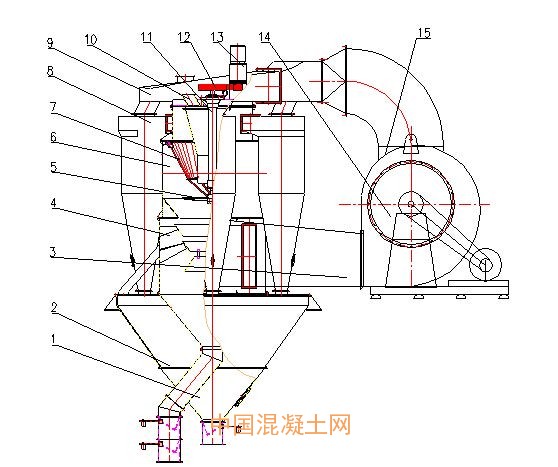 出磨物料由上部進(jìn)料口喂入,落到與轉(zhuǎn)子成一體的撒料盤上,轉(zhuǎn)子隨主軸轉(zhuǎn)動(dòng)時(shí),撒料盤上的物料在離心力的作用下沿徑向甩出而分散于選粉室內(nèi)與旋轉(zhuǎn)上升的氣流相遇,在選粉室內(nèi),分級(jí)圈下面附近的氣流及分散于氣流中的物料在分級(jí)圈的帶動(dòng)下與分級(jí)圈一起作高速旋轉(zhuǎn),而使氣流中的物料受較強(qiáng)的離心力,該力的大小可以通過調(diào)節(jié)主軸的轉(zhuǎn)速來調(diào)節(jié)。當(dāng)轉(zhuǎn)速增大時(shí),該力也增大。此時(shí)如果保持處理風(fēng)量一定,則此時(shí)的切割粒徑減小,產(chǎn)品變細(xì),如轉(zhuǎn)速降低則產(chǎn)品變粗。物料中的粗顆粒,質(zhì)量較大,受撒料盤和分級(jí)圈作用,落到滴流裝置時(shí),再次受上升氣流的分選,落到內(nèi)錐,從粗粉管排出,通過分級(jí)圈的細(xì)粉經(jīng)旋風(fēng)筒收集落入集灰斗,經(jīng)細(xì)粉管排出,清除細(xì)粉后的空氣則從旋風(fēng)筒中心經(jīng)風(fēng)管返回節(jié)能減震風(fēng)機(jī)形成氣流閉路循環(huán)。