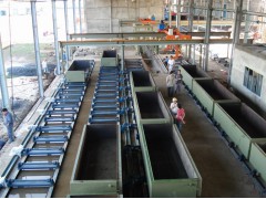 詳細信息 鑫順機械-混凝土加氣塊設備工藝概括鑫順機械是專業生產加氣塊設備,混凝土加氣塊,加氣混凝土砌塊設備,免蒸壓加氣混凝土砌塊設備的廠家。有專業的技術人員負責安裝調試設備,從原料的處理到成品出廠做全程規劃、指導建廠等服務。 1、蒸壓加氣塊混凝土砌塊設備工藝之原料儲存和供料 粉煤灰或者砂子均由汽車運入廠內, 在原材料場集中堆放,使用時裝運入料斗。袋裝水泥或散裝水泥在水泥庫內儲存。使用時裝運入料斗。化學品、鋁粉等分別放在化學品庫、鋁粉庫,使用時分別裝運至生產車間。 2、蒸壓加氣混凝土砌塊設備工藝之原材料處理 粉煤灰(或砂、石粉)經電磁振動給料機、膠帶輸送機送入球磨機,磨細后送入攪拌機進行制漿攪拌,然后用渣漿泵送至料漿罐儲存,配料時使用螺旋輸送機送入料漿計量罐自動計量后在進入澆注攪拌機攪拌。石灰經顎式破碎機破碎后經斗式提升機送入石灰儲料倉,然后經螺旋輸送機送入球磨機,磨細后的石灰粉料經風送系統送入粉料倉中儲存。水泥放在儲料罐內,和石灰粉分別用螺旋輸送機自動計量送入粉料計量罐,隨后連同化學品送入澆注攪拌機和粉煤灰漿混合攪拌, 鋁粉少許加水制成鋁粉懸浮液后使用。 3、蒸壓加氣塊混凝土砌塊設備工藝之加氣塊澆注 攪拌好的料漿,在模具已就位的情況下,即可進行料漿澆注,料漿在澆注前應達到工藝要求(約40℃),如溫度不夠,可在料漿計量罐通蒸汽加熱,在物料澆注前0.5~1分鐘加入鋁粉懸浮液。 4、蒸壓加氣塊混凝土砌塊設備工藝之加氣塊初養和切割 澆注后模具用輸送鏈推入初養室進行發氣初凝,室溫為50~70℃,初養時間為1.5-2小時(根據地理有利條件,可免去此工藝),初養后用負壓吊具將模框及坯體一同吊到預先放好釜底板的切割臺上.脫去模框.切割機即對坯體進行橫切、縱切、銑面包頭,模框吊回到運模車上人工清理和除油,然后吊到模車上組模進行下一次澆注,切好后的坯體連同釜底板用天車吊到釜車上碼放兩層,層間有四個支撐,若干個釜車編為一組。 切割時產生的坯體邊角廢料,經螺旋輸送機送到切割機旁的廢漿攪袢機中,加水制成廢料漿,待配料時使用。 5、蒸壓加氣塊混凝土砌塊設備工藝之加氣塊蒸壓及成品 坯體在釜前停車線上編組完成后,打開要出釜的蒸壓釜釜門,先用卷揚機拉出釜內的成品釜車,然后再將準備蒸壓的釜車用卷揚機拉入蒸壓釜進行養護。釜車上的成品用成品夾具或叉式裝卸夾具車夾運到成品堆場,空釜車及釜底板吊回至回車線上,清理后用卷揚機拉回碼架處進行下一次循環。