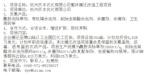 杭州慶豐農化有限公司整體搬遷改造工程項目招商