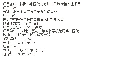 湖南株洲市中醫院特色綜合住院大樓新建項目招商引資