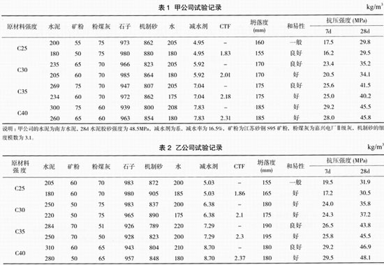 說明:乙公司的水泥同為南方水泥,28d水泥膠砂強度為49.0MPa,減水劑為脂肪族,減水率為17%,礦粉為江蘇砂鋼S95礦粉,粉煤灰為嘉興電廠二級灰,機制砂的細度模數為3.2。