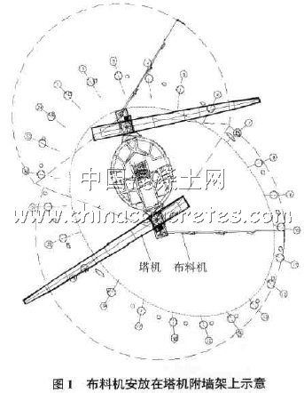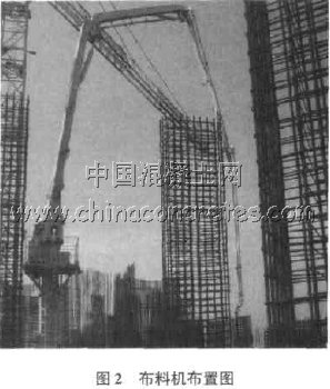 該工程核芯筒結構與鋼管砼結構柱是其他工種施工的先導,對工程建設的工期起著控制作用,砼的泵送是需要解決的難題之一。該工程選用布料機的砼泵送工藝,因而布料機的選擇和布置成了重要課題。