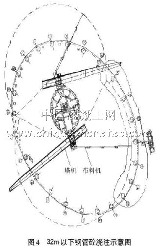 經過比較與論證,該工程最后采用第3 種布置方案。原因一是布料機重量只有塔機的1/10左右,二是我們在計算時充分考慮了砼泵送時的動荷載影響,三是設計了布料機與平臺間可靠的節點連接。32.8m 以上的鋼管砼柱澆注和內外筒之間的砼采用HG32 布料桿和HG28 布料桿進行,如圖3 所示。32.8m 以下的結構部分,一方面由于布料機安裝前,需要開始鋼管砼的澆注,另外一方面由于尚有少數鋼管不在HG32 的布料機回轉半徑內,因此在地面布置一臺泵車配合澆注,如圖4 所示。