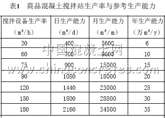 根據生產規模的大小來決定砼攪拌設備的生產能力。選擇設備生產率,應充分考慮商品砼供需不均衡的這一固有的特點,既要從企業年生產規模出發,又要考慮高峰需求和一次集中連續供應的能力。如年產量20萬m 3 以下,砼攪拌設備生產率一般不小于90m3/h;年產量在20 萬~30m3,砼攪拌設備生產率一般為120m3/h;年產量30萬m 3 以上,砼攪拌備生產率一般為150m 3/h 或200m3/h。表1 列出攪拌設備容量選擇的參考數據。