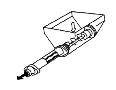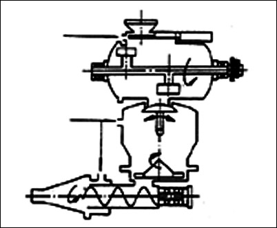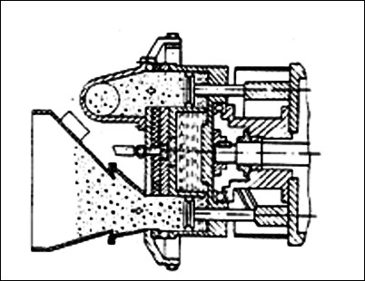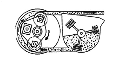 是日本德斯古馬恩型濕噴機(jī)工作原理圖。該濕噴朵為豎立的兩個(gè)罐,上罐拌料,下罐噴射,上下罐均有密封閽門,交替開啟,關(guān)閉,以實(shí)現(xiàn)連續(xù)噴射。下罐底部有一橫臥螺旋驅(qū)動濕拌和料至料管內(nèi)噴射出去。這種濕噴機(jī)的缺點(diǎn) 是上料高度大。比較笨重。