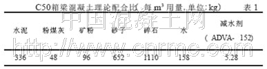 為滿足混凝土的耐久性, 提高混凝土的抗裂性能。在設計箱梁混凝土配合比時, 首先確立設計目標: 低水膠比( 0.33) , 大坍落度( 180mm±20mm) , 5d 抗壓強度>40MPa,10d 抗壓強度>50MPa, 混凝土芯部最高溫度≤60℃, 28d 電通量≤800 庫侖。設計的主要步驟包括: ①確定適宜的膠凝材料總量; ②確定適宜的膠凝材料( 水泥、粉煤灰、礦粉) 的摻量比例。根據原材料情況和以往經驗, 按照水泥摻量40%~70% 、粉煤灰摻量10%~15% 、礦粉摻量20%~45% , 分別采用不同摻配比例進行配合比正交設計, 對混凝土拌和物性能、力學性能、耐久性能各項指標進行檢測, 從中選定配合比如下:其各項性能見下表, 均滿足設計要求。膠凝材料總量為480kg, 水泥用量為336kg, 外摻料用量為144kg, 摻量30%, 有效地降低了混凝土的最高溫升。對該配合比內部溫度進行實測, 環境溫度為28℃時, 混凝土拌和物出機溫度為30℃, 混凝土芯部最高溫度為58℃, 滿足設計要求。按照混凝土絕熱升溫公式(