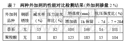 本公司今年用于生產(chǎn)的聚羧酸防凍劑透明、呈淡黃色,外加劑的粘度低,比重小于1.1 kg/ m3 。使用拉法基P. O.42.5水泥作為基準(zhǔn)水泥,按減水劑、防凍劑和泵送劑標(biāo)準(zhǔn)試驗(yàn)方法對(duì)比檢測(cè)了TZ1-3 萘系防凍劑和聚羧酸防凍劑的鋼筋銹蝕、減水率、壓力泌水率、坍落度增加值和保留值及- 7 天和( - 7 +28) 天抗壓強(qiáng)度比性能,見(jiàn)表7 。