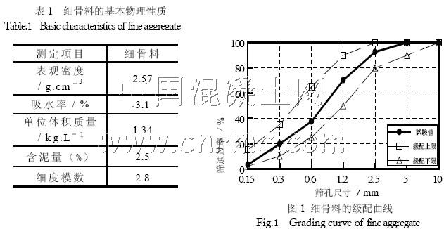 試驗用細骨料采用阜新市白玉都河砂。圖1 表示砂的級配曲線。表1 表示細骨料的基本物理性質(zhì)。