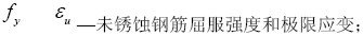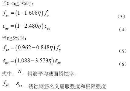 對于模擬鋼筋材料的link8單元,定義一個應力-應變關系的數據表,采用雙線性等向強化(BISO)模型描述混凝土和鋼筋的應力-應變關系。文獻[6]通過電化學銹蝕試驗并結合非線性有限元分析,給出了銹蝕鋼筋名義屈服強度和延伸率的變化規律,本文按其提出的計算公式(3~6)進行分析計算: