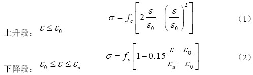在solid65單元中的材料屬性需通過定義兩個數據表:一個是本構關系的數據表,采用多線性等向強化(MISO)模型描述混凝土應力-應變關系;另一個用于定義混凝土的破壞準則,通過混凝土單元材料特性表定義混凝土的裂縫張開剪力傳遞系數、閉合剪力傳遞系數、單軸和多軸抗壓強度等9個參數, 定義混凝土的William-Warnke強度準則。本構關系選擇混凝土單軸向受壓應力應變曲線的E.Honested 建議的模型(公式1~2)。