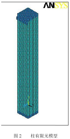 采用實體建模功能直接建模,采用分離模型考慮鋼筋和混凝土之間的滑移, 通過三個非線性彈簧單元,分別代表沿接觸面平行于縱向鋼筋和垂直于縱向鋼筋方向模擬鋼筋與混凝土間的相互作用,來實現位移協調。網格劃分為適當的密度有助于收斂,在建模過程中對單元尺寸進行有效控制,可以有效避免應力集中帶來的問題,在鋼筋混凝土模型的單元尺寸取5cm。鋼筋混凝土柱形狀很規則,采用映射方式單元劃分,混凝土單元是5832個Solid65 單元,鋼筋單元是1908個Link8 單元,鋼筋與混凝土的粘結單元是2592個combin39單元。網格劃分情況見圖2。
