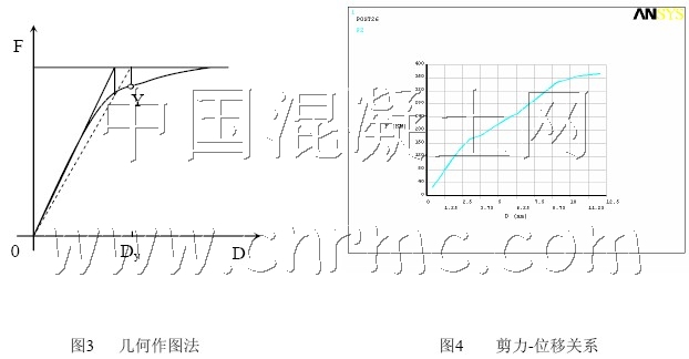 鋼筋混凝土柱的屈服點判斷是一個比較復雜的問題,國內外尚無統一標準。本文采用文獻[8]介紹的幾何作圖法(如圖3所示),Y點為確定的力-變形曲線上的屈服點,對應的Dy為屈服時的構件或結構初始屈服變形。采用此方法可在圖 上確定出該柱的初始屈服位移為7.8mm,依據此位移值,可確定鋼筋混凝土柱進行彈塑性有限元分析的起始位移可選為7.5mm。