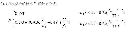混凝土的破壞準(zhǔn)則采用在ANSYS 程序中默認(rèn)的混凝土破壞準(zhǔn)則——William-Warnke 破壞準(zhǔn)則[5],本構(gòu)關(guān)系采用普通圓鋼管混凝土的約束混凝土本構(gòu)關(guān)系[6]。混凝土的彈性模量,單軸抗壓強(qiáng)度和單軸抗拉強(qiáng)度按我國《混凝土結(jié)構(gòu)設(shè)計(jì)規(guī)范》確定,泊松比根據(jù)韓林海提出