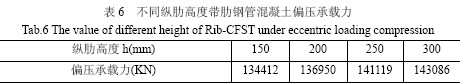 從表7 可以發(fā)現(xiàn),縱肋高度大于250mm 時(shí),縱肋與鋼管面積之比大于0.5690,普通圓鋼管混凝土設(shè)置縱肋后其偏壓承載力增加量僅相當(dāng)同型號(hào)尺寸空鋼管偏壓承載力0.4753,縱肋部份鋼材的強(qiáng)度作用未能充分發(fā)揮,有超過20%的損耗。而當(dāng)縱肋高度不大于250mm 時(shí),只有不超過15%的損耗,且縱肋高度越小,其損耗越小。