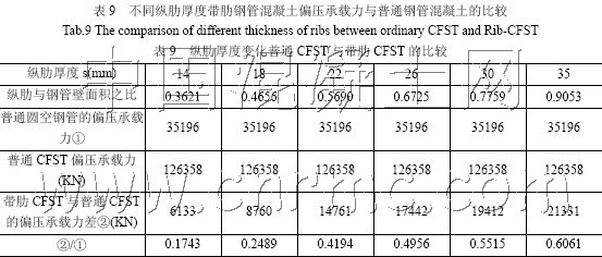 從表9 中可以知道,只有在縱肋與鋼管壁面積之比為0.5690,縱肋厚為22mm 時(shí),其縱肋部份鋼材的強(qiáng)度承載力損耗是最少是,僅為15%;當(dāng)縱肋與鋼管壁面積之比小于0.5690時(shí),其承載力損耗在20%左右;當(dāng)縱肋與鋼管壁面積之比大于0.5690 時(shí),其承載力損耗逐漸增大,當(dāng)縱肋與鋼管壁面積之比達(dá)到0.9 時(shí),其承載力損耗達(dá)到30%,損耗非常大。由于可知,通過增加縱肋厚度的方法增加縱肋與鋼管壁的面積比從而達(dá)到增加偏壓承載力的途徑是非常不可取的。
