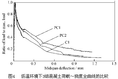 養護溫度為5°C和-15°C各12h。對照組試件置于標準環境中養護。表3為混凝土各齡期強度。基準混凝土C0在28d齡期之前就出現了凍壞現象。低溫下混凝土的韌性均大于標準環境下的混凝土。圖4為3組混凝土荷載~撓度全曲線的比較圖。