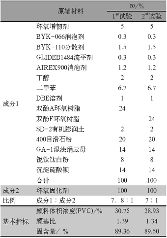 選擇低分子量液體雙酚A環氧樹脂(或低分子量液體雙酚F環氧樹脂),與由腰果殼油(烷基酚)、甲醛及多元胺三者經過曼尼期堿反應得到的縮合產物——酚氨基醇固化劑為成膜物質;選擇沉淀硫酸鋇、濕法絹云母為主要防銹顏填料,并用適量的鈦白粉與之配合。濕面混凝土防腐涂料基本配方見表1。