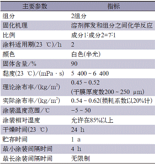開桶時,首先將桶外的灰塵、雜物除盡以免混入涂料桶內,影響質量。使用前,將各組分各自攪拌均勻后,再按規定的比例混合攪拌均勻。一旦混合在一起,要在適用期內用完,所以要求掌握好用量。雙組分混合均勻后,需靜置5~10min,以保證施工性能和涂膜性能。一般不推薦使用稀釋劑,但如果使用空氣噴涂可加入少量的專用稀釋劑。少量的稀釋劑即可大大降低黏度;過量的稀釋劑會引起流掛。涂料在調配后可使用80目的金屬網或尼龍絲篩進行過濾,將涂料中可能產生的或混入的固體顆粒、漆皮或其他雜質濾去,以避免影響施工進度以及涂膜的性能和外觀。配漆及涂裝過程中嚴禁混入水、酸、堿等物。施工參數如表5所示。