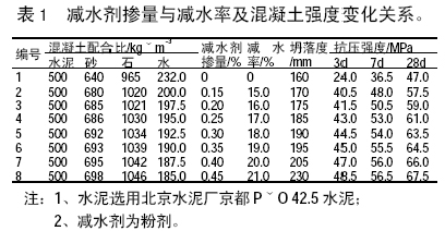 在不同減水劑摻量的情況下,配制高強(qiáng)度、大流動(dòng)性的混凝土,測(cè)定混凝土的坍落度及強(qiáng)度。具體混凝土配合比和試驗(yàn)結(jié)果見(jiàn)表1。