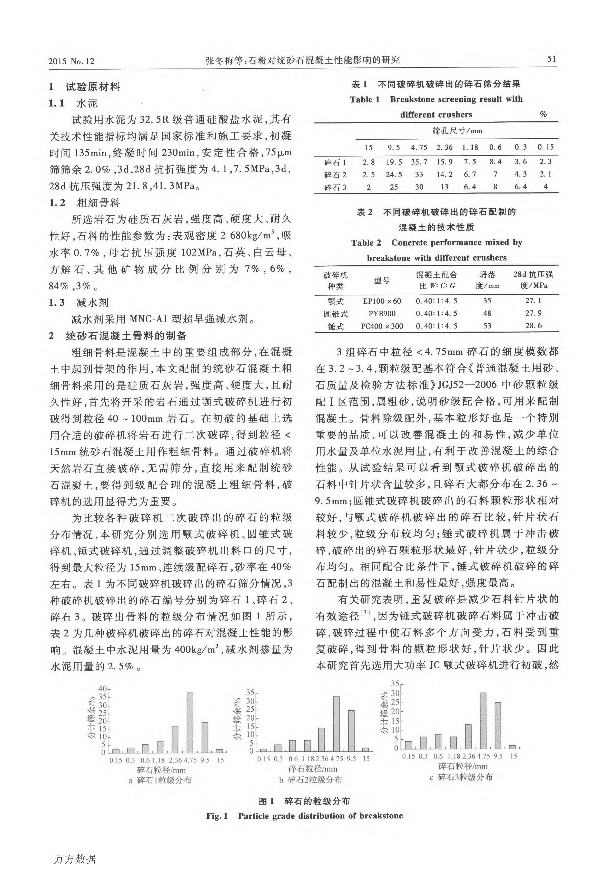 核心提示:采用3種不同破碎機械將天然巖石破碎,通過篩分試驗得出錘式破碎機破碎的碎石顆粒形狀好,針片狀少,級配合理,配制出的混凝土和易性好,抗壓強度高.對不同含量及不同粒級石粉的統砂石混凝土性能進行試驗研究,結果表明石粉含量在統砂石質量的4% ~8%時,能得到性能不低于甚至好于普通混凝土的統砂石混凝土,且石粉越細,混凝土性能越好.當石粉含量在6%時,用統砂石配制的混凝土和易性好、28d抗壓強度可達39.7MPa,從而為配制性能良好的統砂石混凝土提供依據.