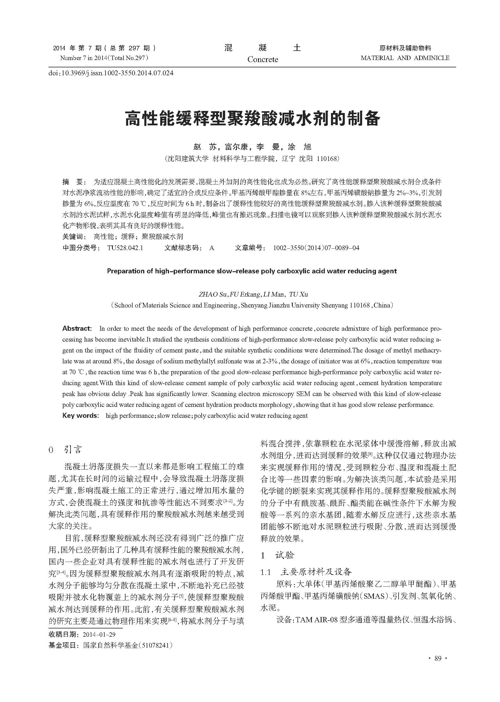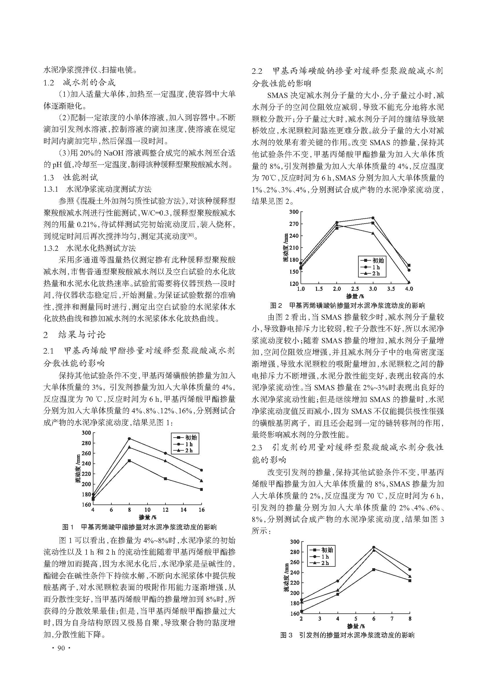 核心提示:為適應混凝土高性能化的發展需要,混凝土外加劑的高性能化也成為必然。研究了高性能緩釋型聚羧酸減水劑合成條件對水泥凈漿流動性能的影響,確定了適宜的合成反應條件。甲基丙烯酸甲酯摻量在8%左右,甲基丙烯磺酸鈉摻量為2%~3%,引發劑摻量為6%,反應溫度在70℃,反應時間為6 h時,制備出了緩釋性能較好的高性能緩釋型聚羧酸減水劑。摻入該種緩釋型聚羧酸減水劑的水泥試樣,水泥水化溫度峰值有明顯的降低,峰值也有推遲現象。掃描電鏡可以觀察到摻入該種緩釋型聚羧酸減水劑水泥水化產物形貌,表明其具有良好的緩釋性能。