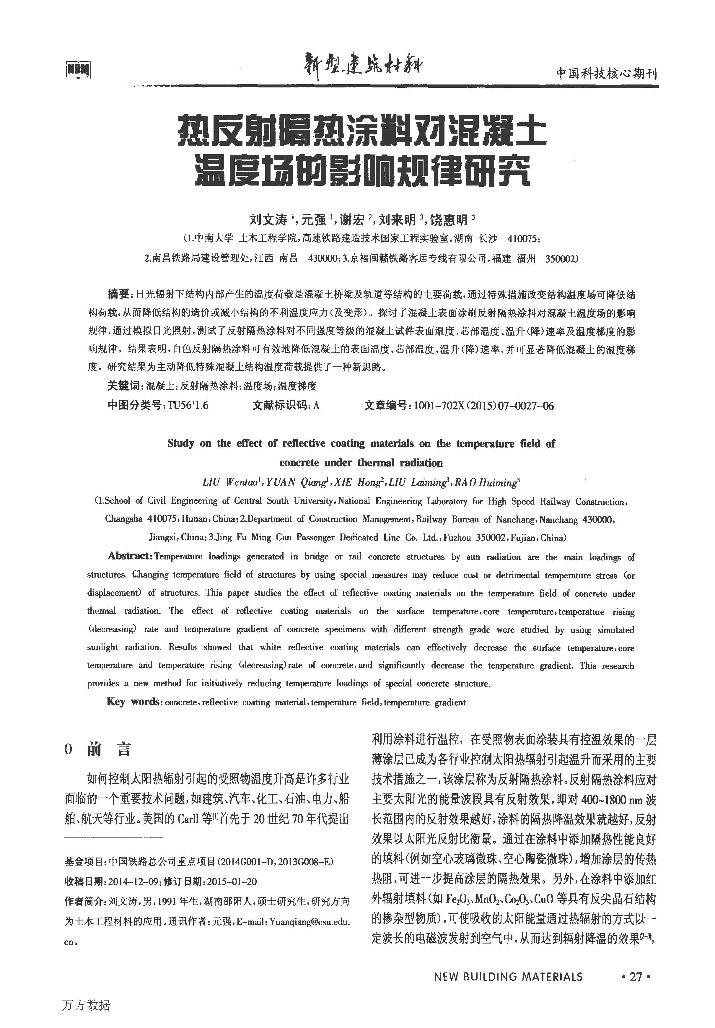 核心提示:日光輻射下結構內部產生的溫度荷載是混凝土橋梁及軌道等結構的主要荷載,通過特殊措施改變結構溫度場可降低結構荷載,從而降低結構的造價或減小結構的不利溫度應力(及變形).探討了混凝土表面涂刷反射隔熱涂料對混凝土溫度場的影響規律,通過模擬日光照射,測試了反射隔熱涂料對不同強度等級的混凝土試件表面溫度、芯部溫度、溫升(降)速率及溫度梯度的影響規律.結果表明,白色反射隔熱涂料可有效地降低混凝土的表面溫度、芯部溫度、溫升(降)速率,并可顯著降低混凝土的溫度梯度.研究結果為主動降低特殊混凝土結構溫度荷載提供了一種新思路.