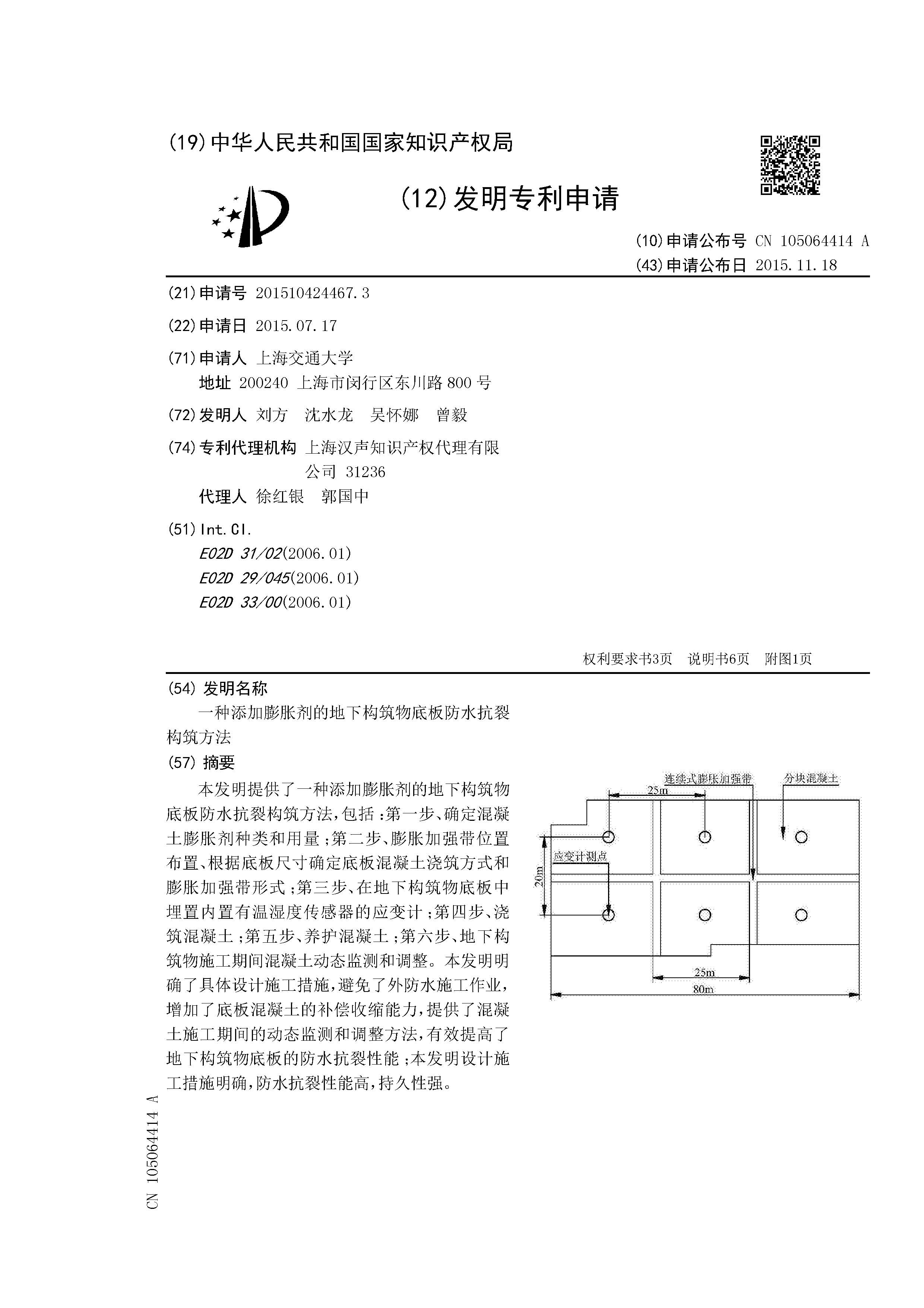 點(diǎn)擊下載全文:一種添加膨脹劑的地下構(gòu)筑物底板防水抗裂構(gòu)筑方法(公開號:CN105064414A)