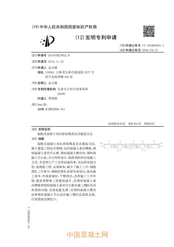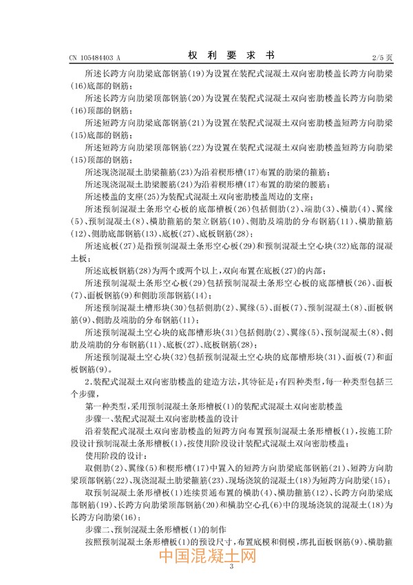 核心提示:裝配式混凝土雙向密肋樓蓋及其建造方法,屬于建筑工程技術領域,包括混凝土條形槽板、預制混凝土條形空心板、預制混凝土槽形塊、預制混凝土空心塊,共計四種設計、構件預制和安裝施工方式。本發明生產工藝和設備簡單,吊運和安裝方便,免模板工程,無需抹灰,減少了施工工序,鋼筋綁扎工作量少、鋼筋的綁扎質量容易保證,提高施工效率,外觀質量好、平整清潔,改善施工工作環境,能顯著降低工程建設成本;其預制混凝土條形槽板和預制混凝土條形空心板在施工期間具有承重的功能,無需設置支撐;其預制混凝土槽形塊和預制混凝土空心塊在施工期間雖需要