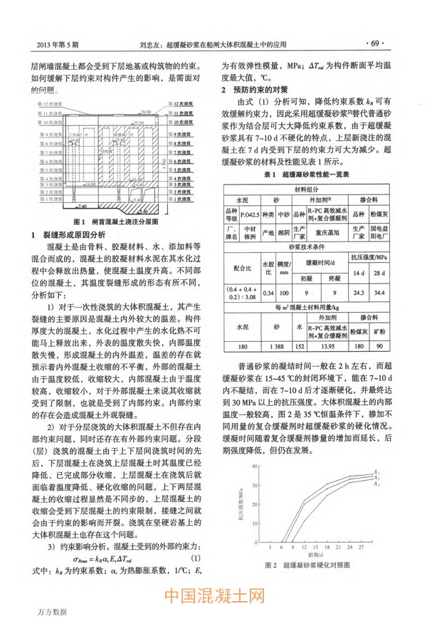 核心提示:大體積混凝土的約束裂縫是由于混凝土早期強度較低,約束應(yīng)力超過了混凝土的抗拉能力造成的.文章結(jié)合長沙湘江船閘大體積混凝土的施工,介紹超緩凝砂漿的性能,由于其突出的緩凝性,可有效防止層間早期約束,達到減小外在約束應(yīng)力的目的.長沙船閘工程在采用了大體積混凝土配合比的同時,應(yīng)用了層間超緩凝砂漿,有效降低了大體積混凝土約束裂縫的產(chǎn)生,取得了較好的效果.