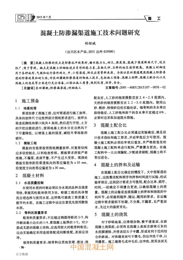 核心提示:混凝土防滲的優點是防滲抗沖效果好,輸水能力大,耐久、強度高,能減少渠道斷面尺寸,適應性廣,便于管理。缺點是混凝土襯砌板適應變形的能力差,在缺乏砂、石料的地區造價較高。混凝土襯砌適用于各種地形、氣候和運行條件的大、中、小型渠道,附近應有骨料來源。為保證農田渠道現澆混凝土防滲渠道的防滲效果和耐久性,對農田灌溉防滲渠道襯徹施工技術,包括施工預備、混凝土材料、混凝土配合比以及混凝土的澆筑等方面進行充分準備,以保證施工質量,做到優質、經濟、安全。