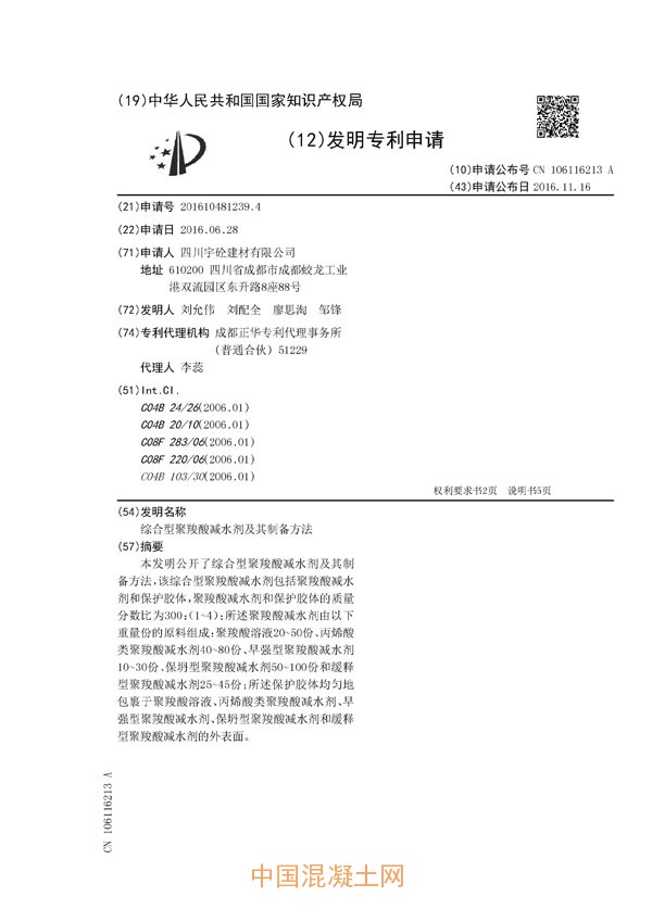 綜合型聚羧酸減水劑及其制備方法(公開號:CN106116213A)