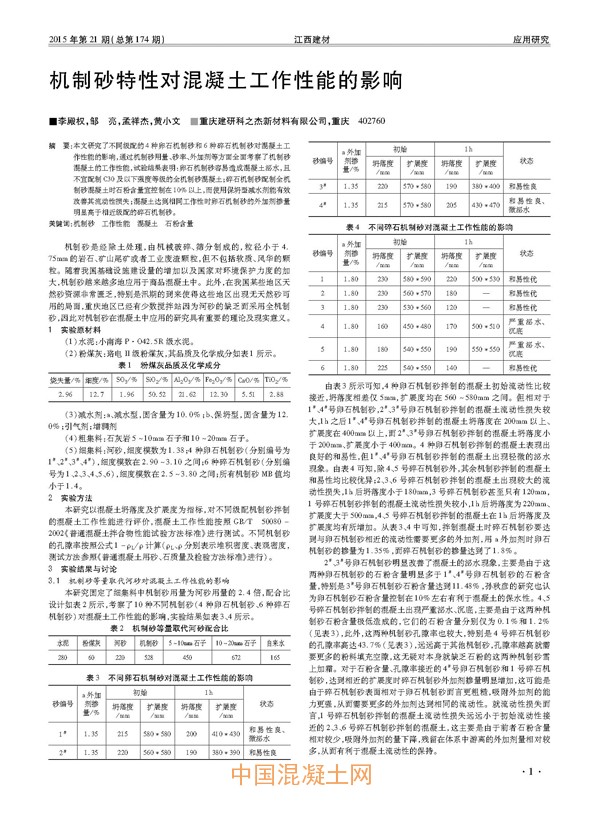 核心提示:本文研究了不同級配的4 種卵石機制砂和6 種碎石機制砂對混凝土工作性能的影響,通過機制砂用量、砂率、外加劑等方面全面考察了機制砂混凝土的工作性能,試驗結果表明:卵石機制砂容易造成混凝土泌水,且不宜配制C30 及以下強度等級的全機制砂混凝土;碎石機制砂配制全機制砂混凝土時石粉含量宜控制在10%以上,而使用保坍型減水劑能有效改善其流動性損失;混凝土達到相同工作性時卵石機制砂的外加劑摻量明顯高于相近級配的碎石機制砂。