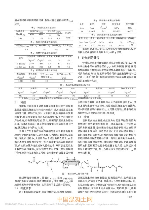 核心提示:研究了外加劑中減縮、增韌和黏度調節組分對混凝土工作性能、力學性能、體積穩定性能、彎曲韌性指數等的影響,探討了外加劑減縮、增韌和黏度調節的機理,制備了高韌性低收縮混凝土:28 d抗折強度>7.0 MPa,28 d抗壓強度50~56 MPa,彎曲韌性指數I20>20,180 d干燥收縮率小于430×10-6,并成功應用于遂西高速李家戶大橋橋面鋪裝,取消了鋼筋網片,取得了顯著的經濟效益。