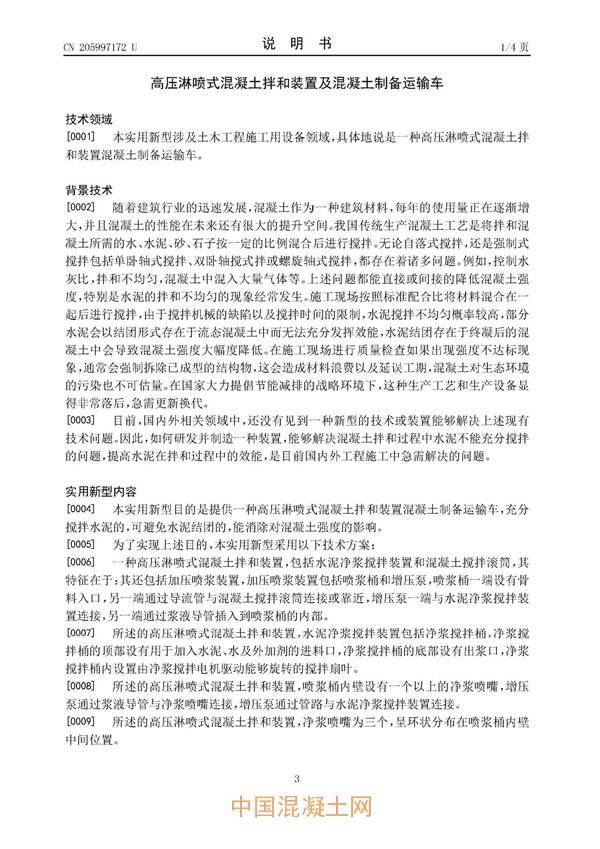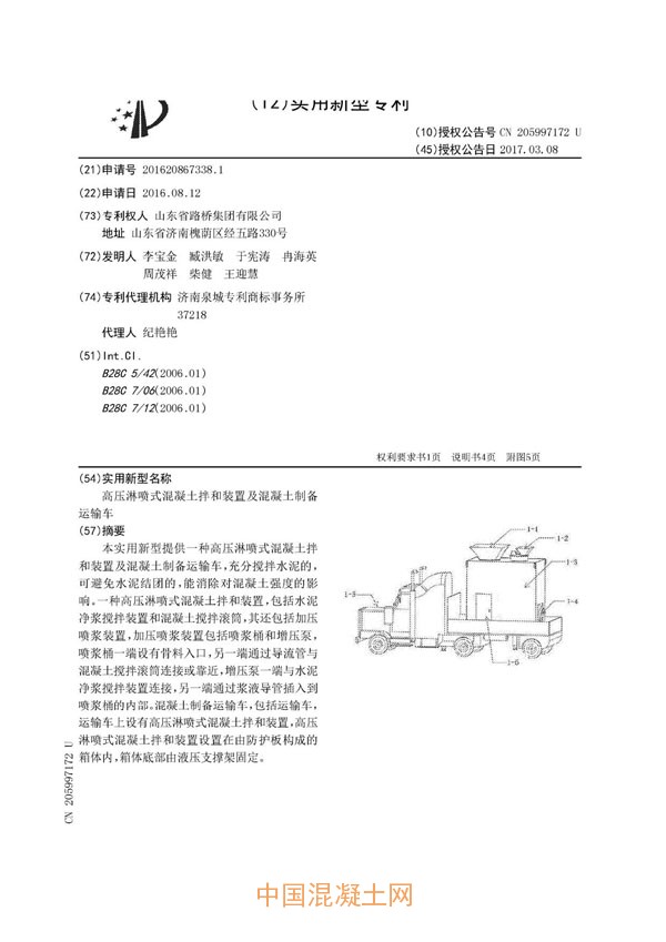高壓淋噴式混凝土拌和裝置及混凝土制備運輸車(公開號:CN205997172U)