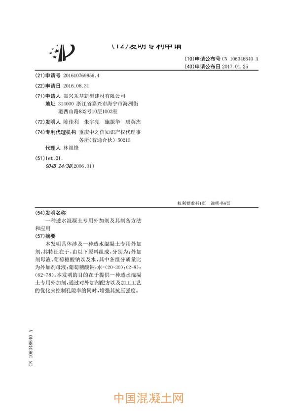 一種透水混凝土專用外加劑及其制備方法和應用(公開號:CN106348640A)