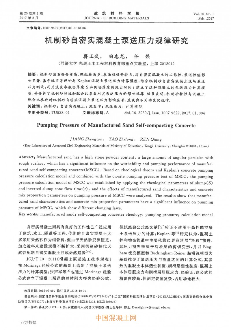 核心提示:機制砂因石粉含量高、顆粒棱角多、表面粗糙等特點,對自密實混凝土的工作性、泵送性能影響顯著.基于流變學理論與Kaplan混凝土泵送壓力計算模型,結合機制砂自密實混凝土現場泵送壓力測試,利用流變參數坍落度S和倒坍落度筒流出時間t建立了這種混凝土的泵送壓力計算模型,并分析了機制砂特性和配合比參數對其泵送壓力的影響規律.結果表明:機制砂特性與混凝土配合比參數對機制砂自密實混凝土泵送壓力影響顯著,呈現出不同的變化規律.