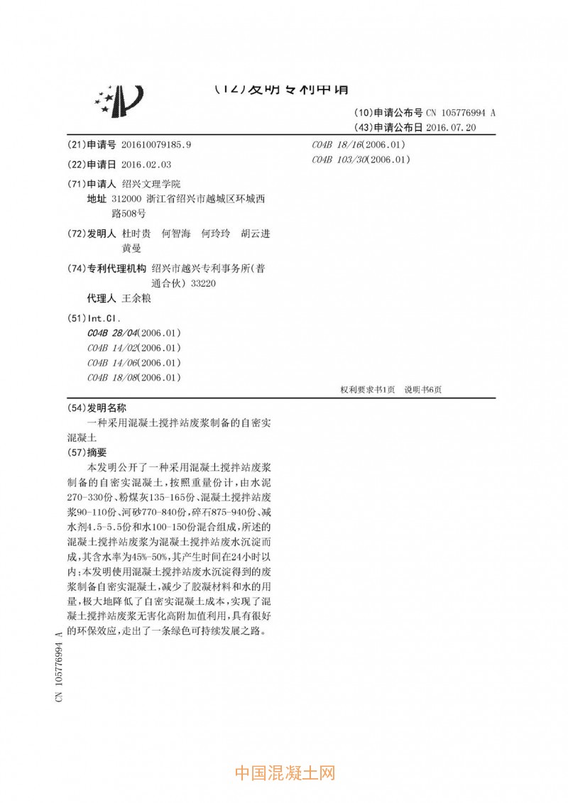 一種采用混凝土攪拌站廢漿制備的自密實混凝土(公開號:CN105776994A)