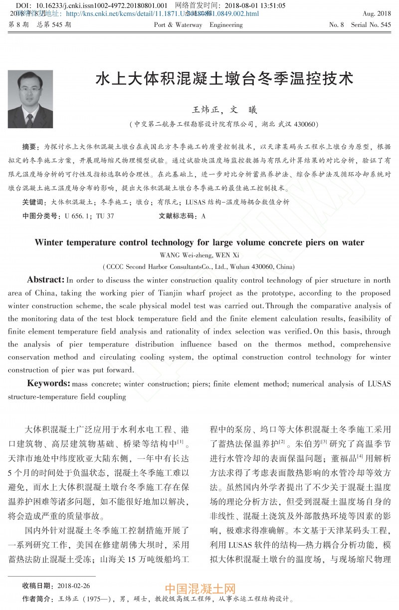 核心提示:為探討水上大體積混凝土墩臺在我國北方冬季施工的質量控制技術,以天津某碼頭工程水上墩臺為原型,根據擬定的冬季施工方案,開展現場縮尺物理模型試驗。通過試驗塊溫度場監控數據與有限元計算結果的對比分析,驗證了有限元溫度場分析的可行性及指標選取的合理性。在此基礎上,進一步對比分析蓄熱養護法、綜合養護法及循環冷卻系統對墩臺混凝土施工溫度場分布的影響,提出大體積混凝土墩臺冬季施工的最佳施工控制技術。