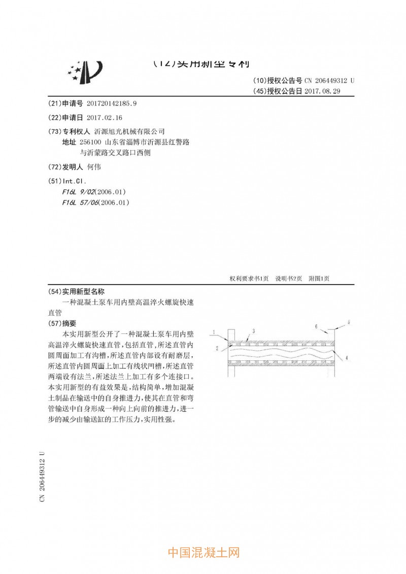 一種混凝土泵車用內壁高溫淬火螺旋快速直管(公開號:CN206449312U)