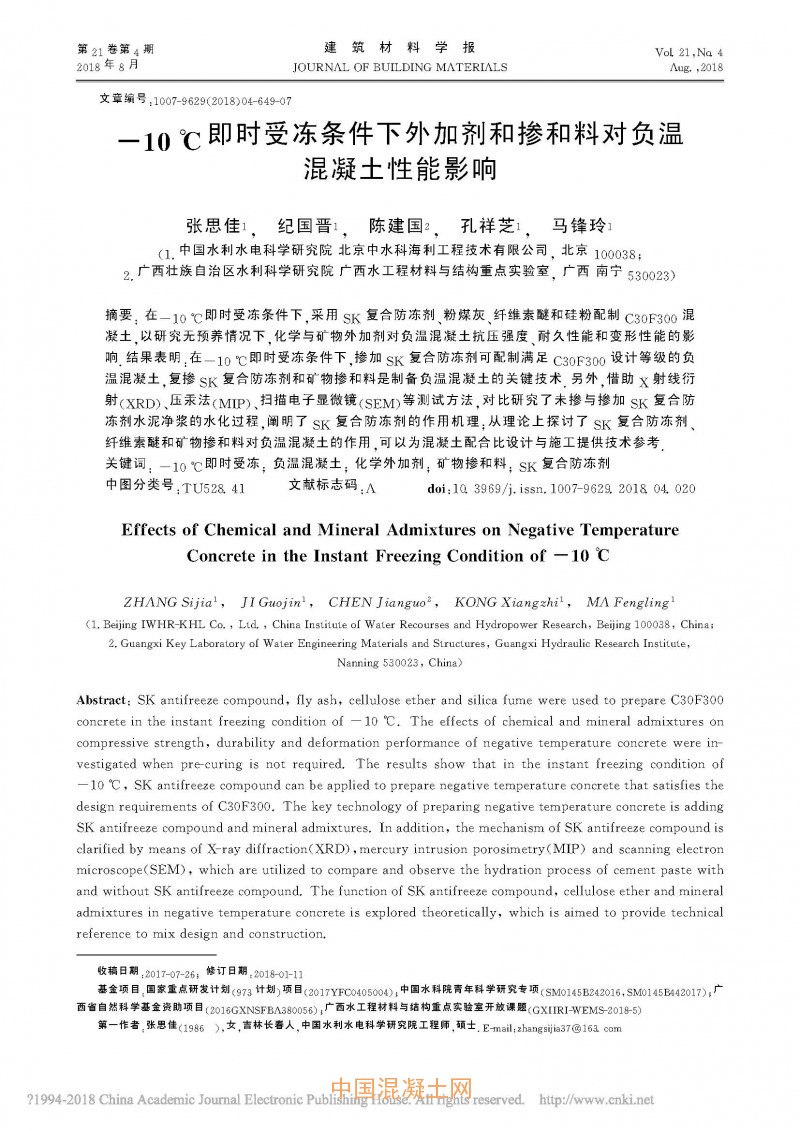 核心提示:在-10℃即時受凍條件下,采用SK復合防凍劑、粉煤灰、纖維素醚和硅粉配制C30F300混凝土,以研究無預養情況下,化學與礦物外加劑對負溫混凝土抗壓強度、耐久性能和變形性能的影響.結果表明:在-10℃即時受凍條件下,摻加SK復合防凍劑可配制滿足C30F300設計等級的負溫混凝土,復摻SK復合防凍劑和礦物摻和料是制備負溫混凝土的關鍵技術.另外,借助X射線衍射(XRD)、壓汞法(MIP)、掃描電子顯微鏡(SEM)等測試方法,對比研究了未摻與摻加SK復合防凍劑水泥凈漿的水化過程,闡明了SK復合防凍劑的作用機理;從