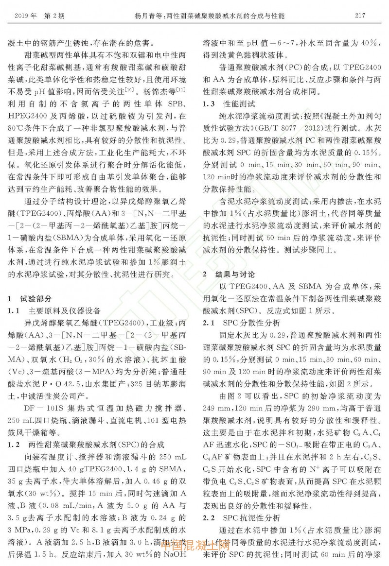 核心提示:以異戊烯醇聚氧乙烯醚(TPEG2400)、丙烯酸(AA)和3-[N,N-二甲基-[2-(2-甲基丙-2-烯酰氧基)乙基]胺]丙烷-1-磺酸內鹽(SBMA)為單體,過氧化氫(H2O2)/抗壞血酸(Vc)為引發劑,3-巰基丙酸(3-MPA)為鏈轉移劑,采用氧化還原體系,在常溫條件下合成了一種兩性甜菜堿聚羧酸減水劑SPC。以水泥凈漿流動度為評價指標,測試結果表明,水灰比為0. 29、SPC折固摻量為水泥質量0.15%時,在純水泥凈漿和水泥中膨潤土摻量為1%時,SPC與普通聚羧酸減水劑相比具有較好的分散性、緩釋性