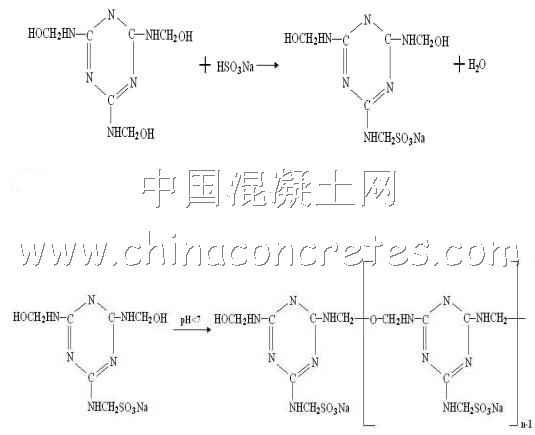(3)單體縮合:將單磺酸鹽置于一定的介質條件下,羥甲基之間縮合而生成醚鍵,使羥甲基三聚氰胺單磺酸鈉單體之間以醚鍵相互聯接起來,制成能溶解于水的線性高分子;