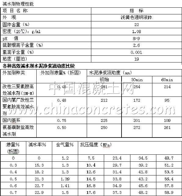 ⑥體積穩定性好,耐久性要求高,表面干縮裂縫少、混凝土抗滲性要求高,有的還有耐腐蝕要求。(2)SM-M和萘系、聚羧酸系高效減水劑應用效果對比
