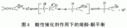 常用的酸性催化劑有(VO)2P207、α VOHPO4、鈮酸和MFI沸石等。在酸性催化劑的陽離子活性中心(Brnsted中心或Lewis中心),醛羰基活化形成烯醇正碳離子從而發生縮合反應。酸催化的烯醇 酮平衡可表示為已有的研究發現,催化劑表面酸性活性中心的種類、數目和分布都會影響其催化性能,適宜的酸強度能有效促進氣相羥醛縮合反應過程中正碳離子的形成,提高反應活性。