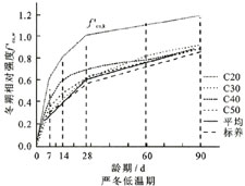 R -7+28 ——受檢負溫混凝土在規定溫度下負溫養護 7d 再轉標準養護 28d 的抗壓強度與基準混凝土標準養護 28d 抗壓強度之比,單位為百分數 ( % ) ;