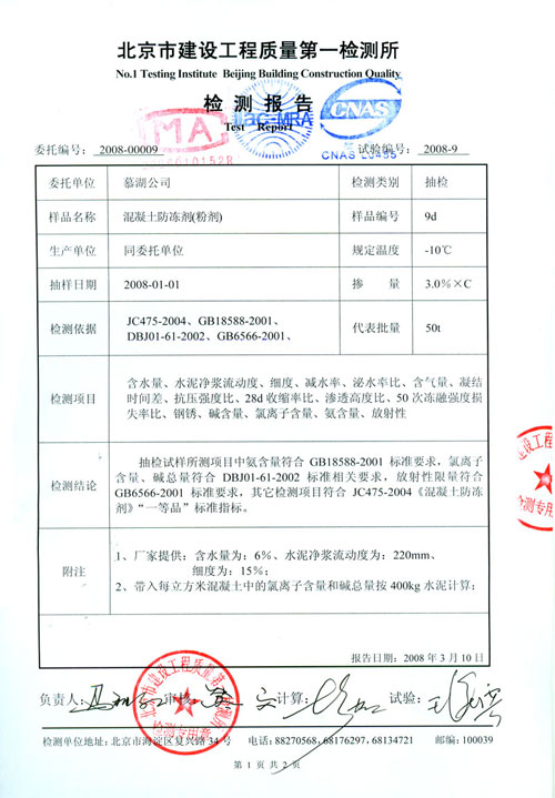 生產廠應隨貨提供說明書和產品檢驗合格證。產品說明書包括:產品名稱、主要防凍組分及堿含量 (Na 2 O+0.658K 2 O) 、適用范圍、規定溫度、摻量、禁用場合、貯存條件、有效期、使用方法及注意事項。
