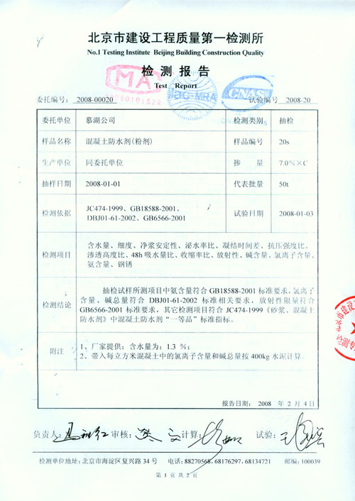 使用單位:湖北省隨州市三建公司 使用產(chǎn)品及數(shù)量: MNC-D 2 早強(qiáng)型膨脹防水劑, 17 噸。 MNC-A 1 超早強(qiáng)劑, 3.5 噸。 使用效果:良好。 聯(lián)系電話:( 0722 ) 3239329 聯(lián)系人:黃維策